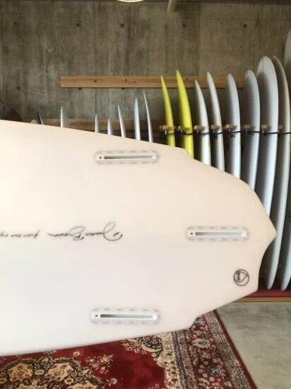 5'10", Clear both side, sanded gloss,future tri box fins.